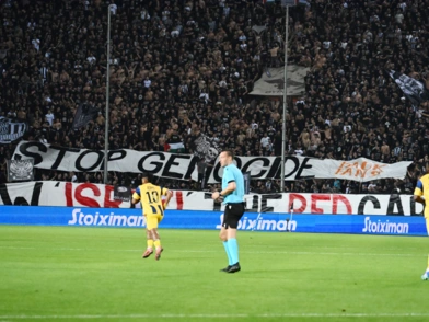 Συγκεκριμένα λίγα λεπτά μετά την πρώτη σέντρα του αγώνα, από την Θύρα 4, εκεί όπου βρίσκεται ο κύριος όγκος των οργανωμένων οπαδών του ΠΑΟΚ αναρτήθηκαν δύο πανό στα Αγγλικά. Το ένα έγραφε «SHOW ISRAEL ΤΗΕ RED CARD» (δ.δ Δείξτε στο Ισραήλ κόκκινη κάρτα) κι αναφέρεται στη σκέψη που υπάρχει στην ΟΥΕΦΑ για αποβολή των ομάδων του Ισραήλ από τις ευρωπαϊκές διοργανώσεις, ενώ το δεύτερο πανό έγραφε «STOP GENOCIDE» (σ.σ Σταματήστε την γενοκτονία).