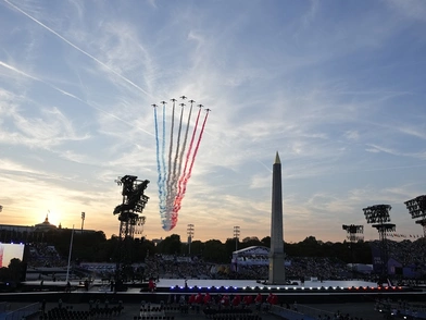 Οι εικόνες από το Παρίσι με φόντο την Αψίδα του Θριάμβου είναι άκρως εντυπωσιακές, καθώς πριν την παρέλαση των αθλητών, μαχητικά αεροσκάφη σχημάτισαν στον γαλλικό ουρανό τα χρώματα της σημαίας.