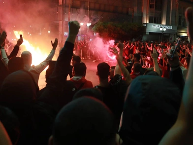 Εκατοντάδες φιλάθλων με τη λήξη της αναμέτρηση στο Καραϊσκάκης ξεχύθηκαν στους δρόμους του Πειραιά για να πανηγυρίσουν τη μεγάλη επιτυχία, μία ημέρα μετά και από την πρόκριση της ομάδας μπάσκετ και στο φετινό Final-4 της Ευρωλίγκας.