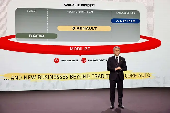 Όπως ανέφερε χαρακτηριστικά ο Ιταλός μάνατζερ, «θα εξελιχθούμε από ένας όμιλος αυτοκινήτου που εργάζεται με τεχνολογία, σε μία επιχείρηση τεχνολογίας που εργάζεται με αυτοκίνητα και έως το 2030 θα πετυχαίνει τουλάχιστον το 20% του συνολικού τζίρου της με υπηρεσίες, με δεδομένα και με εμπόριο ενέργειας». Στόχος του γαλλικού ομίλου είναι να καταστεί έως το 2025 κλιματικά ουδέτερος, ενώ στο μέλλον θα απαρτίζεται από τις εξής τέσσερις επιχειρηματικές μονάδες: Renault, Dacia – Lada, Alpine και Mobilize.