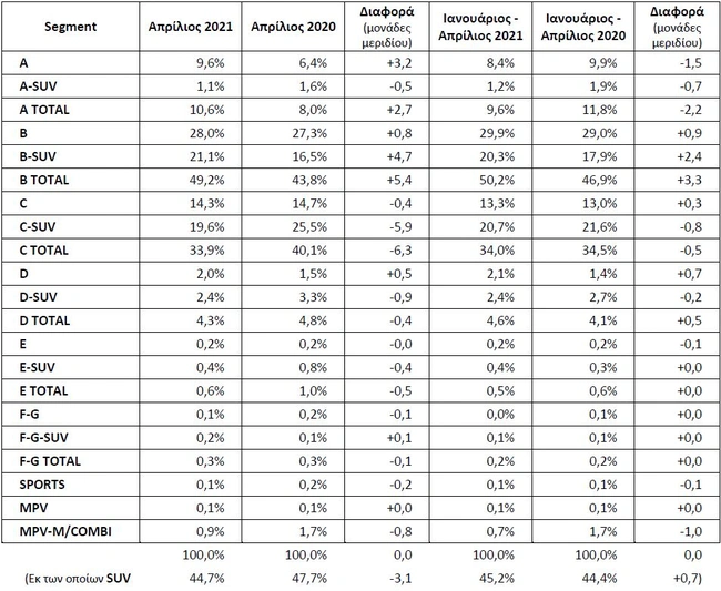 Κοιτάζοντας τις κατηγορίες (Segments) των νέων επιβατικών αυτοκινήτων για το πρώτο 4μηνο, παρατηρούμε ότι τα σουπερμίνι (Β Segment) παραμένουν στην κορυφή των προτιμήσεων των αγοραστών, κερδίζοντας με διαφορά το μεγαλύτερο μερίδιο, που φτάνει στο 46,9% και είναι ελαφρά αυξημένο (3,3%) σε σχέση με πέρυσι. Ακολουθεί η κατηγορία των μικρομεσαίων (C Segment) που παρουσιάζει οριακή πτώση (0,5%) σε σχέση με το 2020. Από τα καινούρια επιβατικά αυτοκίνητα που ταξινομήθηκαν to 4μηνο σχεδόν τα μισά (44,4%) ήταν SUV. Στον παρακάτω πίνακα μπορείτε να δείτε αναλυτικά τις ταξινομήσεις ανά κατηγορία.