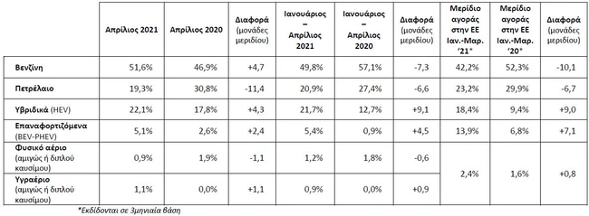 Το μεγαλύτερο ενδιαφέρον ωστόσο στα στοιχεία του ΣΕΕΑ εντοπίζεται στην κατανομή ανά καύσιμο των νέων ταξινομήσεων. Τα βενζινοκίνητα παραμένουν στην πρώτη θέση με ποσοστό 49,8%, αλλά η έκπληξη έρχεται στη 2η θέση, όπου τα υβριδικά (HEV) ξεπέρασαν τα πετρελαιοκίνητα. Το ποσοστό των HEV υβριδικών έφτασε στο 21,7% (από 12,7% πέρυσι) ενώ τα ντίζελ έπεσαν στο 20,9% (από 27,4% στο αντίστοιχο διάστημα του 2020). Μεγάλο άλμα και στα επαναφορτιζόμενα ηλεκτρικά (BEV και PHEV), που αύξησαν το μερίδιό του στο 5,4% (από 0,9% πέρυσι). Στην Ευρωπαϊκή Ένωση ωστόσο τα ντίζελ είναι πάνω από τα υβριδικά αλλά το ποσοστό των επαναφρτιζόμενων ηλεκτρικών είναι αρκετά μεγαλύτερο (13,9%). Αναλυτικά όλα τα στοιχεία στον πίνακα που ακολουθεί.
