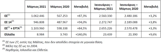 Σε επίπεδο ΕΕ, με βάση τα στοιχεία του Ευρωπαϊκού Συνδέσμου Κατασκευαστών Αυτοκινήτων (www.acea.be), η αγορά των επιβατικών κινήθηκε ως και τον Μάρτιο πολύ ανοδικά, σε σχέση με το περσινό διάστημα, που καθορίστηκε από την πανδημία. Ο παρακάτω πίνακας μας δίνει τα στοιχεία.