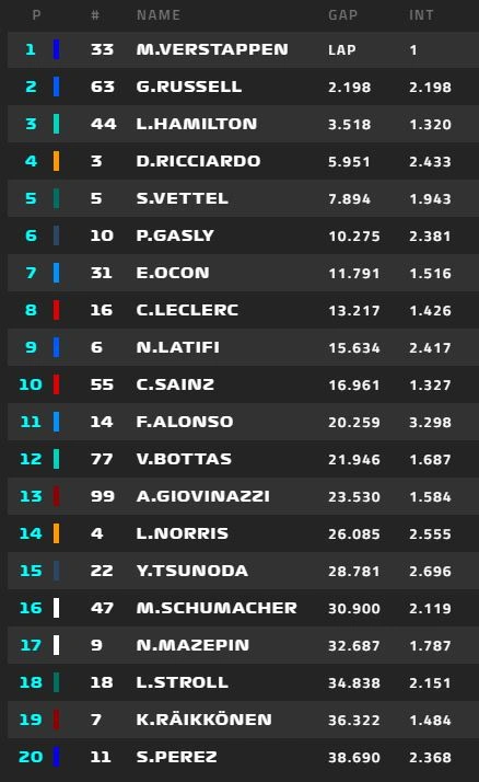 Αυτό σημαίνει ότι ο Μαξ Φερστάπεν με τη Red Bull Racing πήρε τη νίκη και 12,5 εύκολους βαθμούς. Ο Τζορτζ Ράσελ της Williams πήρε τη 2η θέση, 9 βαθμούς και ανέβηκε για πρώτη φορά στο βάθρο ενώ ο Λιούις Χάμιλτον της Mercedes ήταν 3ος και πήρε άκοπα 7,5 βαθμούς και διατηρήθηκε στην κορυφή της βαθμολογίας του πρωταθλήματος. Ακολούθησαν οι Ντάνιελ Ρικάρντο, Σεμπάστιαν Φέτελ, Πιέρ Γκασλί, Εστεμπάν Οκόν, Σαρλ Λεκλέρ, Νικολας Λατίφι και Κάρλος Σάινθ.