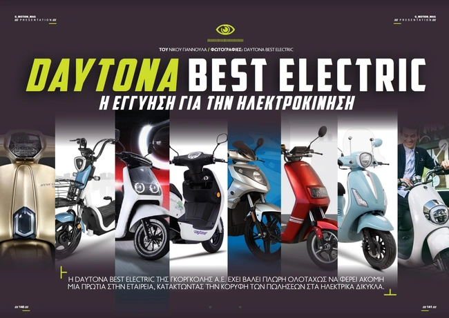 Στους δύο τροχούς, η Daytona Best Electric κερδίζει τις εντυπώσεις τόσο με την εμπορική της επιτυχία, όσο και με την τεράστια γκάμα αμιγώς ηλεκτρικών μοτοσικλετών πόλης, τόσο για ιδιωτική όσο και για επαγγελματική χρήση.