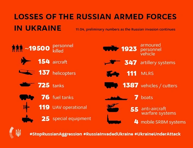 Από την ημέρα που η Ρωσία ξεκίνησε τον πόλεμο στην Ουκρανία έχει θρηνήσει πάνω από 19.500 στρατιώτες, διατείνεται η χώρα που δέχεται την εισβολή των στρατευμάτων του Βλαντίμιρ Πούτιν. Οπως ανέφερε σήμερα Δευτέρα το υπουργείο Αμυνας της Ουκρανίας, οι Ρώσοι έχουν χάσει 1.923 τεθωρακισμένα οχήματα προσωπικού, ενώ έχουν καταστραφεί 137 ελικόπτερα, 725 τανκς και 154 αεροσκάφη.