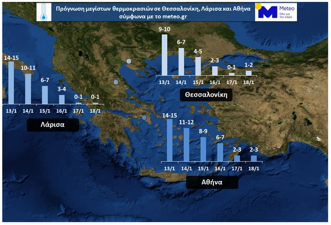 Στην Αθήνα οι μέγιστες χαμηλότερες θερμοκρασίες αναμένονται το διήμερο 17-18/1 όπου θα κυμαίνονται μεταξύ 1-2 βαθμών Κελσίου, ενώ το ίδιο διάστημα αναμένεται πτώση της θερμοκρασίας και στη Λάρισα, όπου αναμένεται να κυμανθεί από 0-1 βαθμούς Κελσίου.