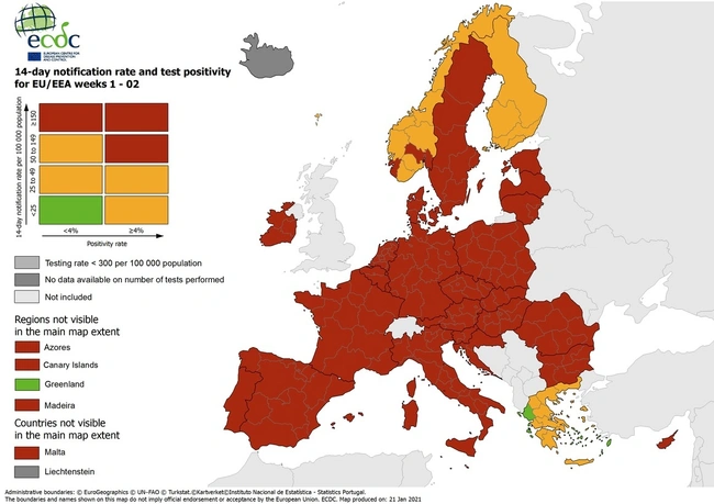 Οι συγκεκριμένοι χάρτες του ECDC ανανεώνονται κάθε Πέμπτη, σύμφωνα με τη Σύσταση του Ευρωπαϊκού Συμβουλίου.