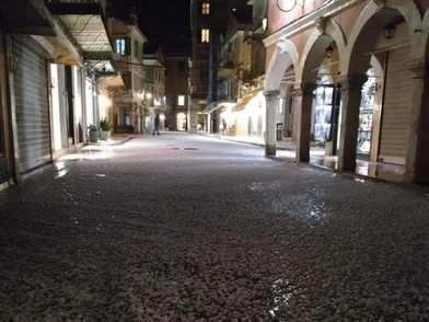 Οι βροντές και αστραπές συνοδεύτηκαν πριν από λίγη ώρα με έντονη χαλαζόπτωση, που έπεφτε σε σχήμα ρεβιθιού, καταφέρνοντας μέσα σε λίγα λεπτά να δημιουργήσει ένα λεπτό στρώμα πάγου στο οδόστρωμα.