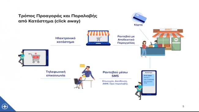 - Η εξ αποστάσεως υποχρεωτική προαγορά των αγαθών (είτε ηλεκτρονικά, είτε τηλεφωνικά είτε μέσω της εφαρμογής e-Καταναλωτής) και παραλαβή από έναν (1) πελάτη και από ειδικά διαμορφωμένο εξωτερικό χώρο των καταστημάτων.