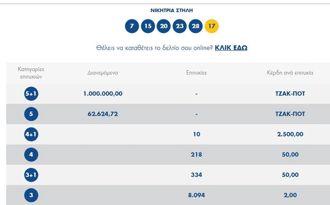 Οι αριθμοί που κληρώθηκαν είναι: 7, 15, 20, 23, 28 και Τζόκερ ο αριθμός: 17