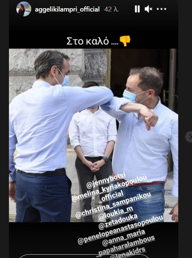 «Στο καλό» ήταν το λακωνικό σχόλιο της Αγγελικής Λάμπρη, με φωτογραφία του Δημήτρη Λιγνάδη με τον πρωθυπουργό. Μάλιστα η ηθοποιός επισήμανε στο story και τις συναδέλφους της που έχουν καταγγείλει ανάλογες συμπεριφορές εναντίον τους.