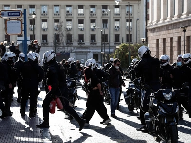 14:26:38 ομάδα ατόμων αποσπάται από τον κύριο όγκο της πορείας και επιτίθεται με καδρόνια στις αστυνομικές δυνάμεις που έχουν δημιουργήσει φραγμό στον χώρο μπροστά από το Μνημείο του Άγνωστου Στρατιώτη στο Σύνταγμα.