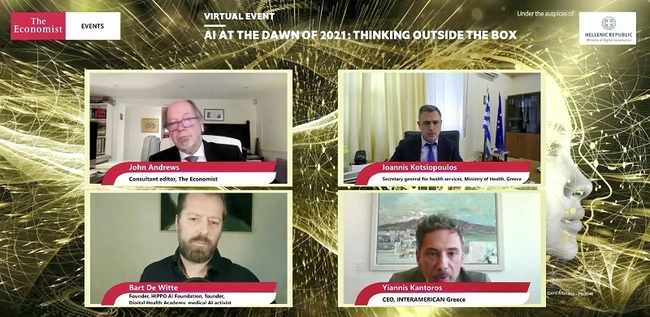 Στο ιδιαίτερα σημαντικό Συνέδριο που οργάνωσε στις 29 Ιανουαρίου ο Economist, με θέμα «Artificial Intelligence at the Dawn of 2021: Thinking outside the box», συμμετείχε ως συνομιλητής σε πάνελ ο Γιάννης Καντώρος, Διευθύνων Σύμβουλος της INTERAMERICAN, ειδικότερα για την εφαρμογή της τεχνητής νοημοσύνης στον τομέα της Υγείας («Artificial Intelligence in Health»). Στο πάνελ, στο οποίο συμμετείχαν ακόμη ο Γιάννης Κωτσιόπουλος, Γενικός Γραμματέας του Υπουργείου Υγείας και ο Bart De Witte, founder (HIPPO AI Foundation, Digital Health Academy, Medical AI), συζητήθηκαν οι εφαρμογές και οι νέες θεραπείες που υπόσχεται η τεχνητή νοημοσύνη. Επίσης, οι συνομιλητές τοποθετήθηκαν για την αξιοπιστία των λύσεων Artificial Intelligence.