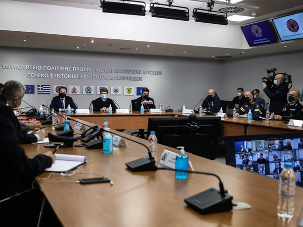 Η σ΄πυσκεψξη πραγματοποιήθηκε υπό τον Υπουργό Προστασίας του Πολίτη, Μιχάλη Χρυσοχοΐδη και τον Υφυπουργό Πολιτικής Προστασίας και Διαχείρισης Κρίσεων, Νίκο Χαρδαλιά, παρουσία του Αναπληρωτή Υπουργού Εσωτερικών αρμόδιου για θέματα Αυτοδιοίκησης, Στέλιου Πέτσα, του Υφυπουργού παρά τω Πρωθυπουργώ στον Υπουργό Επικρατείας, Θεόδωρου Λιβάνιου και του Κυβερνητικού Εκπροσώπου, Χρήστου Ταραντίλη.