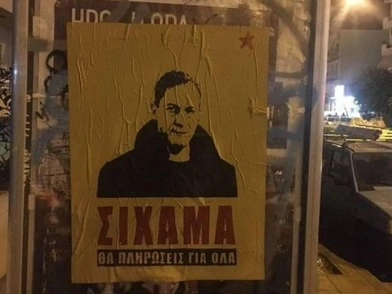 Η αφίσα απεικονίζει τον πρώην πλέον καλλιτεχνικό διευθυντή του Εθνικού Θεάτρου, Δημήτρη Λιγνάδη ενώ το απειλητικό μήνυμα αναφέρει «Σίχαμα, θα πληρώσεις για όλα».