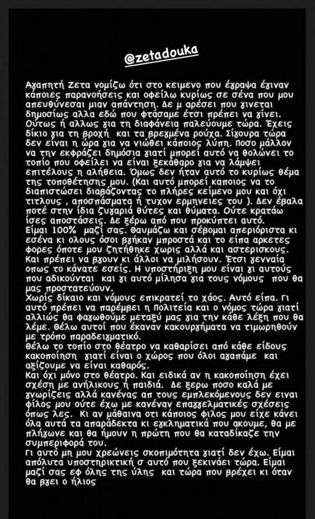 Χωρίς δίκαιο και νόμους επικρατεί το χάος. Αυτό είπα. Γι αυτό πρέπει να παρέμβει η Πολιτεία και ο νόμος τώρα γιατί αλλιώς θα φαγωθούμε μεταξύ μας για την κάθε λέξη που θα λέμε. Θέλω αυτοί που έκαναν κακουργήματα να τιμωρηθούν με τρόπο παραδειγματικό. Θέλω το τοπίο στο θέατρο να καθαρίσει από κάθε είδους κακοποίηση γιατί είναι ο χώρος που όλοι αγαπάμε και αξίζουμε να είναι καθαρός.