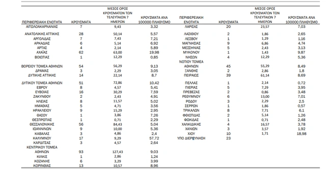 Στην Αττική εντοπίστηκαν 328 νέα κρούσματα, στην Αχαΐα 62, στη Θεσσαλονίκη 56, στη Λάρισα 20 και στην Κάλυμνο 17.