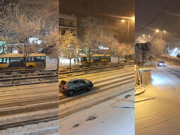 Πυκνή είναι η χιονόπτωση στα βόρεια προάστια της Αττικής, με το χιόνι να καλύπτει τη λεωφόρο Μεσογείων.