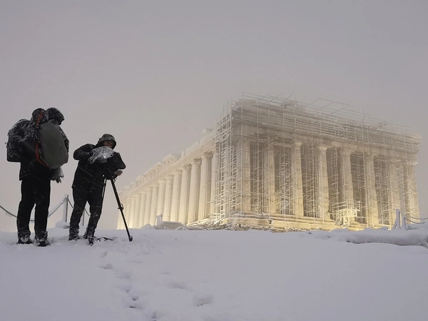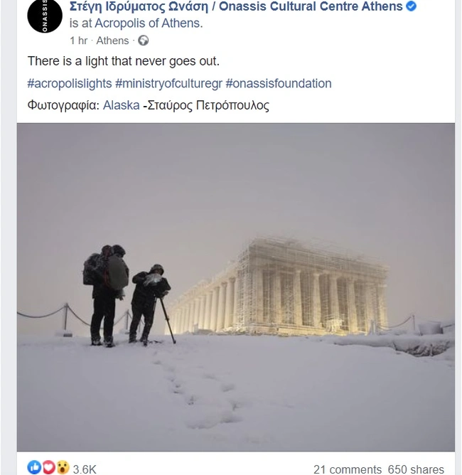 Μια εξαιρετική φωτογραφία της χιονισμένης Ακρόπολης, που τράβηξε για το Ίδρυμα Ωνάση ο Σταύρος Πετρόπουλος, έχει κεντρίσει το ενδιαφέρον των χρηστών στα social media.