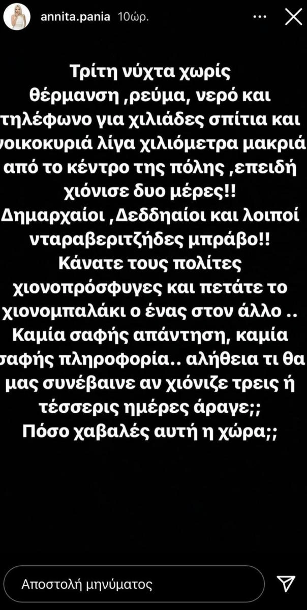 Τον εκνευρισμό της για το γεγονός ότι τόσος κόσμος έμεινε για μέρες χωρίς θέρμανση, νερό και ρεύμα εν μέσω της κακοκαιρίας «Μήδεια» εξέφρασε μέσω stories στο Instagram η Αννίτα Πάνια.