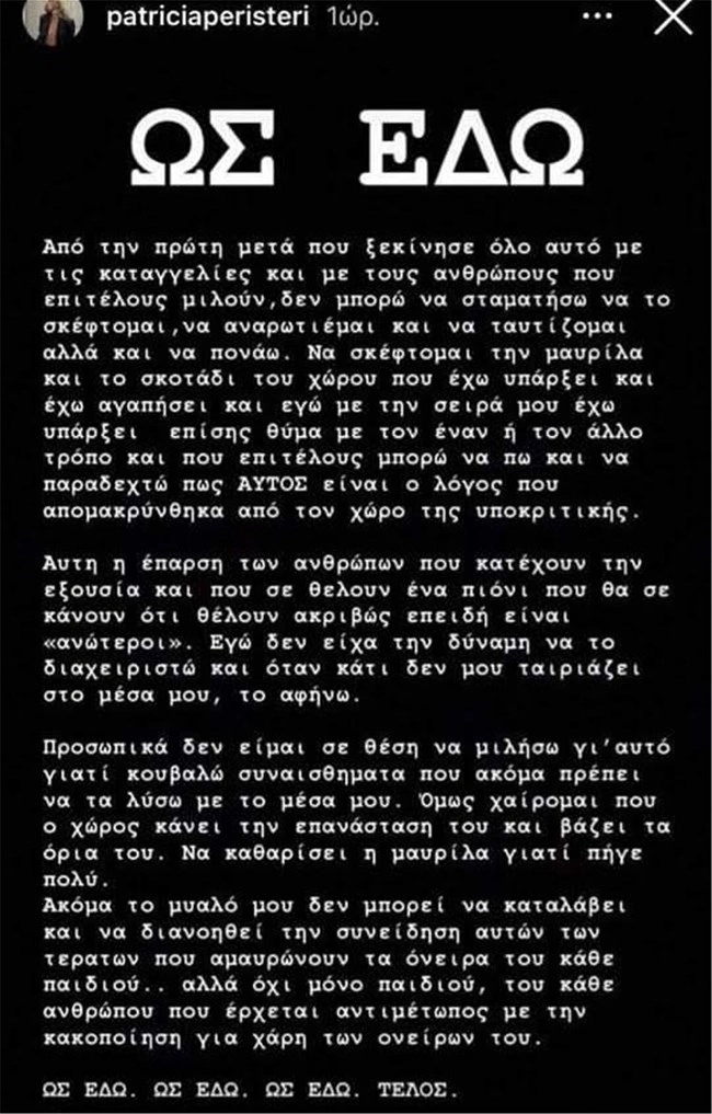 Με μια εκτενή ανάρτηση με τον τίτλο «Ως εδώ» η Πατρίσια Μιλίκ Περιστέρη, παίρνει θέση σχετικά με τις καταγγελίες στον χώρο του θεάτρου και της τηλεόρασης.