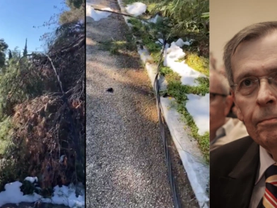 Με βίντεό του μάλιστα στο Twitter, δείχνει τα πεσμένα δέντρα πάνω στα καλώδια της ΔΕΗ.