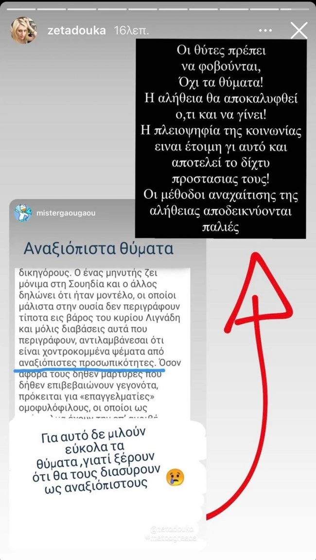 Η Ζέτα Δούκα σχολιάζει με τη σειρά της: «Οι θύτες πρέπει να φοβούνται, όχι τα θύματα! Η αλήθεια θα αποκαλυφθεί ό,τι και να γίνει! Η πλειοψηφία της κοινωνίας είναι έτοιμη γι’ αυτό και αποτελεί το δίχτυ προστασίας τους! Οι μέθοδοι αναχαίτισης της αλήθειας αποδεικνύονται παλιές».