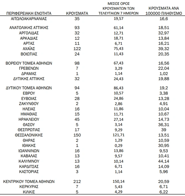 Από εκεί και πέρα, στην Θεσσαλονίκη βρέθηκαν 150 μολύνσεις. Τριψήφιο αριθμό κρουσμάτων συγκεντρώνει και η Αχαΐα με 122 περιπτώσεις.