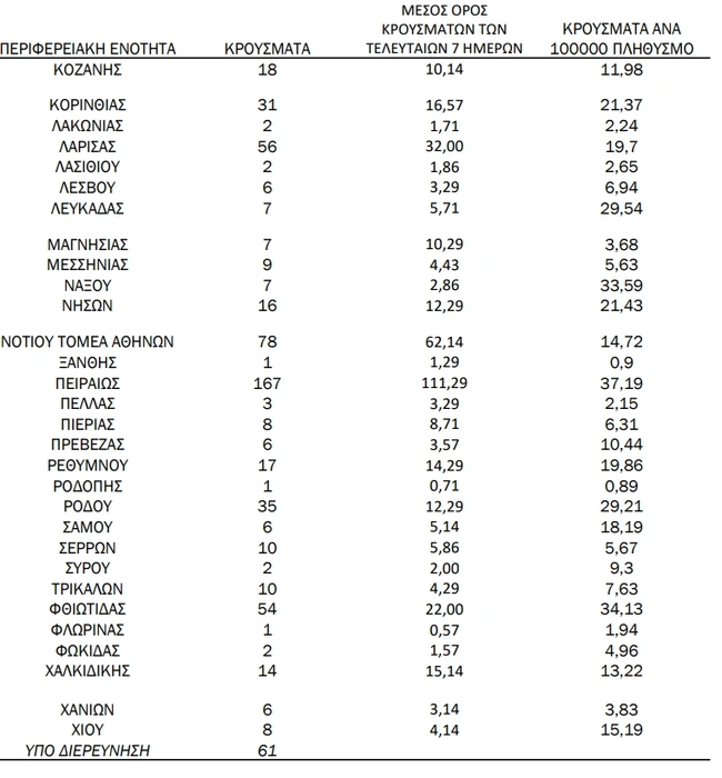 Επίσης, σημειώθηκαν ακόμα 56 στη Λάρισα και 54 στη Φθιώτιδα.