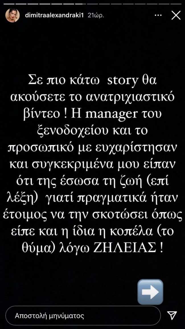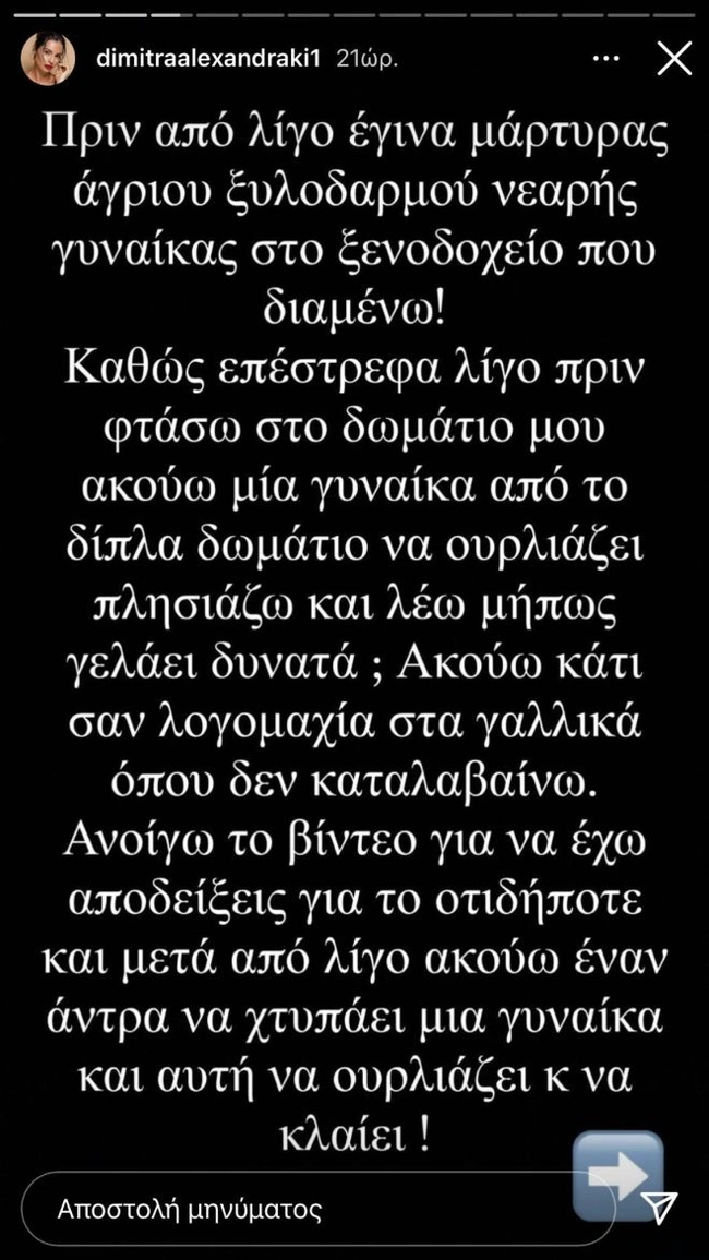Όπως εξήγησε μέσω stories στο Instagram, το γνωστό μοντέλο κατευθυνόταν προς το δωμάτιό της στο ξενοδοχείο όπου μένει, όταν άκουσε στο διπλανό δωμάτιο τα ουρλιαχτά μίας γυναίκας.