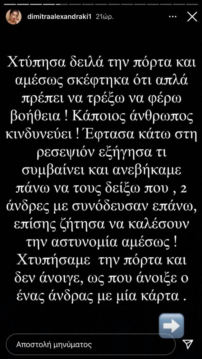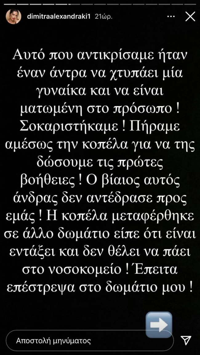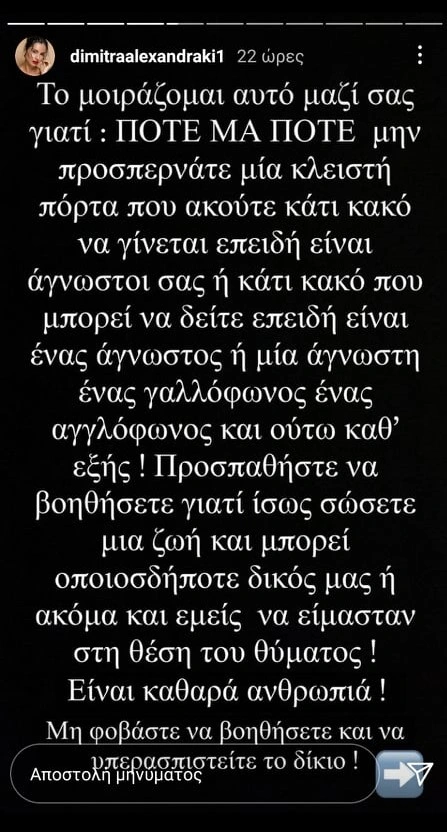 Όπως σημείωσε χαρακτηριστικά η Δήμητρα Αλεξανδράκη, έκανε την παρακάτω κοινοποίηση για να τονίσει πως δεν πρέπει να προσπερνάμε τις εκκλήσεις για βοήθεια.