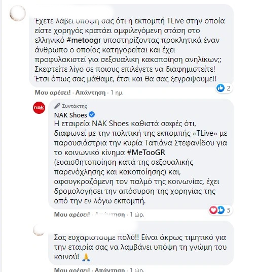Η εταιρεία απάντησε στο σχόλιο το μεσημέρι της Δευτέρας, προαναγγέλοντας απόσυρση της χορηγία της από την εκπομπή της Τατιάνας Στεφανίδου και ξεκαθαρίζοντας ότι διαφωνεί με την πολιτική της. «Η εταιρεία NAK Shoes καθιστά σαφές ότι, διαφωνεί με την πολιτική της εκπομπής «ΤLive» με παρουσιάστρια την κυρία Τατιάνα Στεφανίδου για το κοινωνικό κίνημα #MeTooGR (ευαισθητοποίηση κατά της σεξουαλικής παρενόχλησης και κακοποίησης) και, αφουγκραζόμενη τον παλμό της κοινωνίας, έχει δρομολογήσει την απόσυρση της χορηγίας της από την εν λόγω εκπομπή».