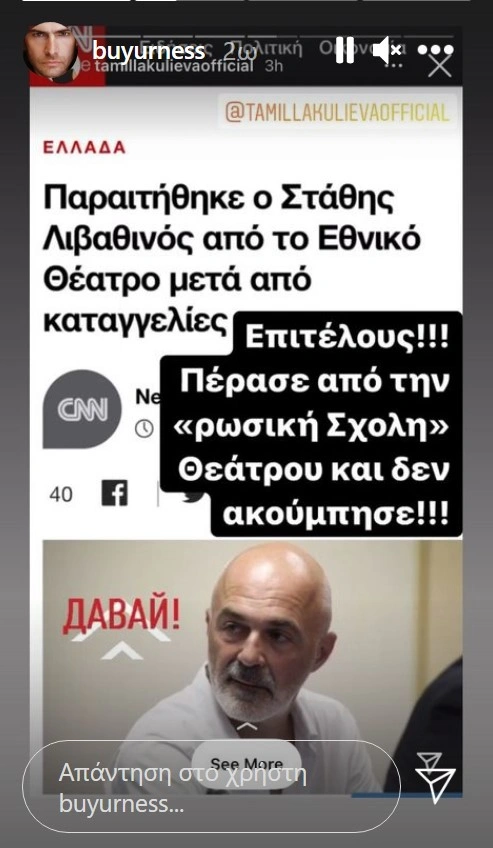 Ο γνωστός ηθοποιός που είχε καταφερθεί εναντίον του πρώην (πλέον) διευθυντή της Δραματικής Σχολής του Εθνικού Θεάτρου καταγγέλλοντάς τον για «χυδαία, προσβλητική» και «σταλινική συμπεριφορά, ψυχολογικής βίας, χειρισμού, τρομοκρατίας και ομοφοβίας», μετά την είδηση της παραίτησής του έγραψε στο Instagram: «Επιτέλους! Πέρασε από την «ρωσική Σχολή» Θεάτρου και δεν ακούμπησε!!!».