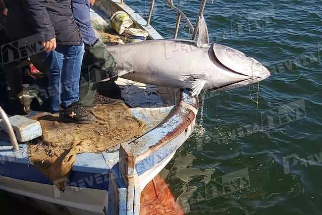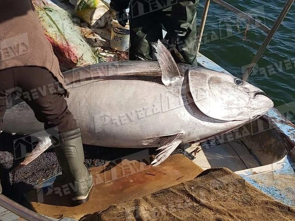 Ο τόνος, σύμφωνα με πληροφορίες του prevezanews, αλιεύτηκε στο Ιόνιο και το βάρος του αγγίζει τα 130 κιλά.