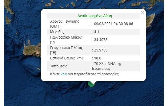 Το επίκεντρο της δόνησης εντοπίζεται στον θαλάσσιο χώρο 70 χλμ νότια/νοτιοανατολικά της Ιεράπετρας.