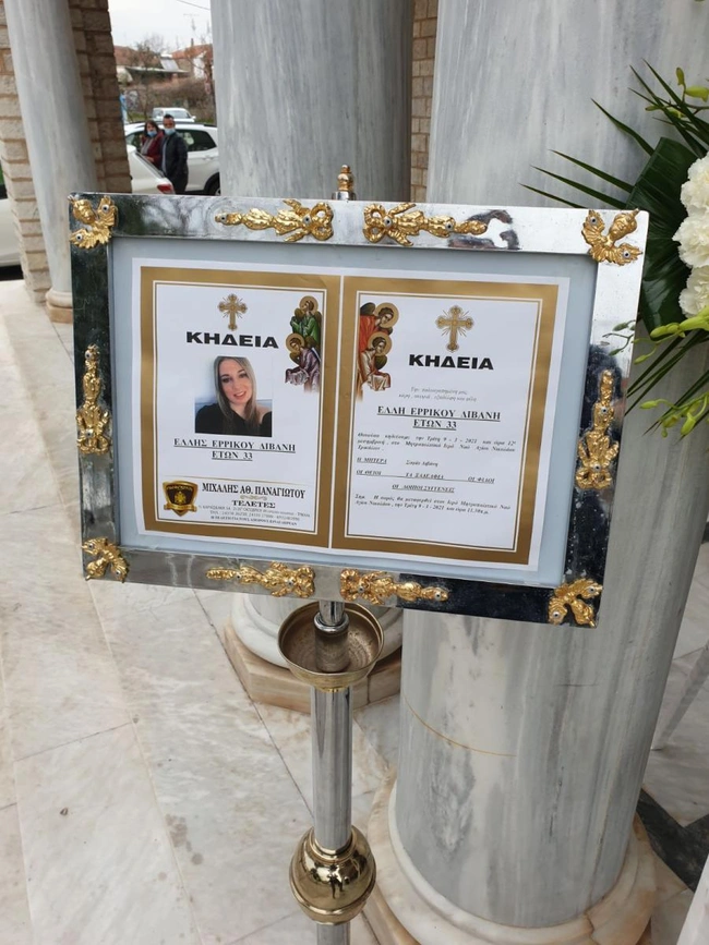 Η εξόδιος ακολουθία της 33χρονης πραγματοποιήθηκε το μεσημέρι της Τρίτης στον Ιερό Μητροπολιτικό Ναό Αγίου Νικολάου, στην πόλη των Τρικάλων, παρουσία 9 ατόμων εντός του Ναού, και δεκάδων συγγενών και φίλων εκτός αυτού σύμφωνα με το trikalavoice.gr.
