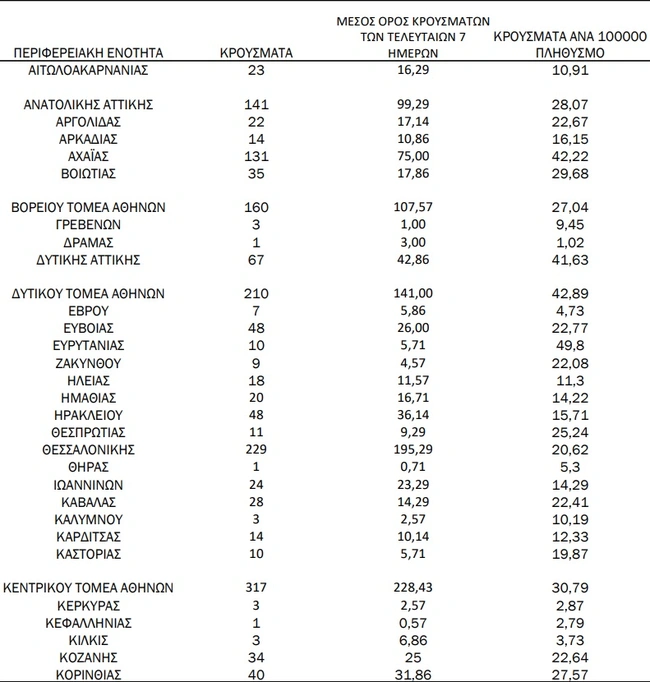 Η κατανομή των κρουσμάτων ανά περιφέρεια, σύμφωνα με τον ΕΟΔΥ, είναι η ακόλουθη: