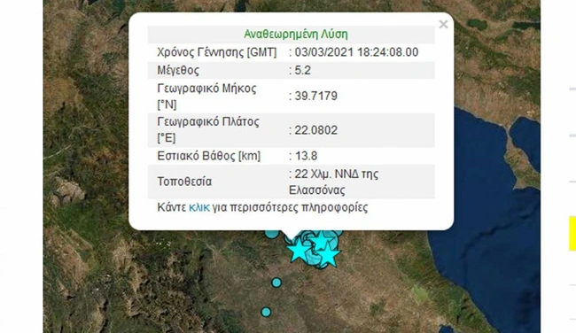 Συγκεκριμένα, νέα ισχυρή σεισμική δόνηση μεγέθους 5,2 Ρίχτερ σημειώθηκε στις 14.57 με επίκεντρο 22 χλμ ΝΔ της Ελασσονας, σύμφωνα με το Γεωδυναμικό Ινστιτούτο.