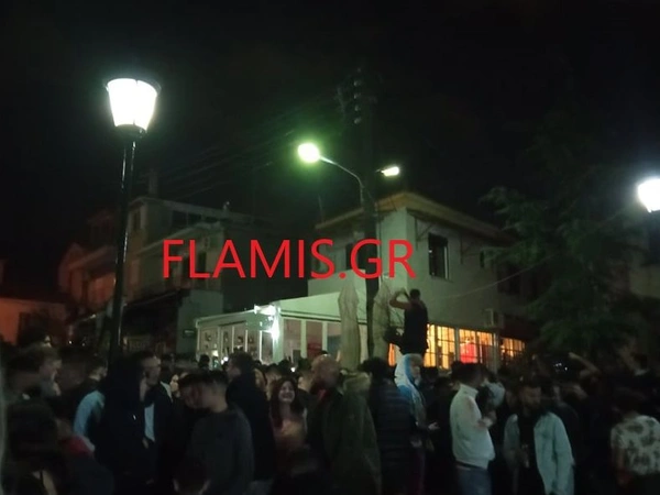 Όπως αναφέρει το flamis.gr, δεκάδες νέοι δίχως μάσκα και με ένα ποτό στο χέρι, περιφέρονταν διασκεδάζοντας και παίζοντας με καπνογόνα και πυροτεχνήματα.