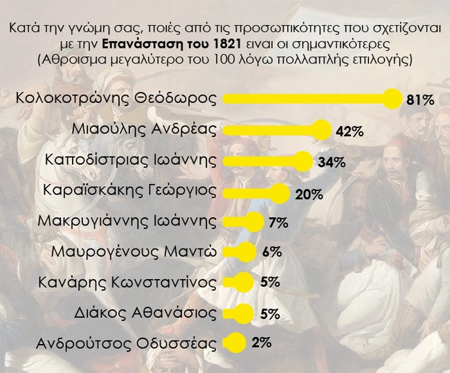 Τον Αρχιστράτηγο Θεόδωρο Κολοκοτρώνη θεωρούν ως κορυφαία προσωπικότητα του Αγώνα, 4 στους 5 ερωτηθέντες και ακολουθούν στην έρευνα ο ναύαρχος Ανδρέας Μιαούλης (42%), ο διπλωμάτης και πολιτικός Ιωάννης Καποδίστριας (34%) και ο στρατηγός Γεώργιος Καραϊσκάκης (20%).