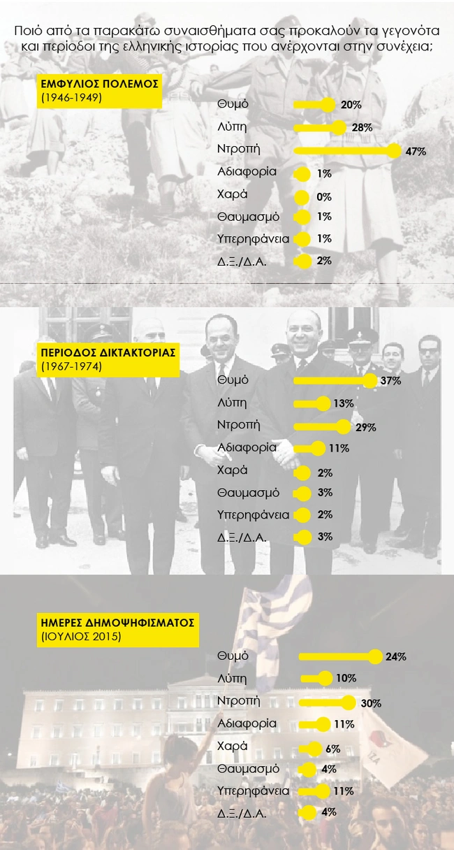Ντροπή νιώθει 1 στους 2 ερωτηθέντες (47%) για τον εμφύλιο, ενώ το ίδιο συναίσθημα νιώθει το 29% για τη Χούντα των Συνταγματαρχών, αλλά και το 30% για τα όσα συνέβησαν τις ημέρες του δημοψηφίσματος το καλοκαίρι του 2015.
