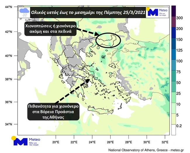 Ιδιαιτέρως για τη Θράκη, χιόνι ή χιονόνερο αναμένεται κατά τόπους ακόμη και σε πεδινές περιοχές. Από το μεσημέρι της 25ης Μαρτίου τα φαινόμενα θα περιοριστούν σημαντικά και αναμένονται μόνο πρόσκαιρες τοπικές βροχές στο κεντρικό και νότιο Αιγαίο, στην Κρήτη και στην νοτιοανατολική Πελοπόννησο.