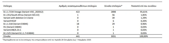 Από τα 423 δείγματα με στελέχη VOC, τα 422 βρέθηκαν με τη μετάλλαξη Β.1.1.7/UK lineage (Variant VOC_202012) και ένα δείγμα με τη μετάλλαξη Lineage B.1.351/South Africa (Variant 501.V2), ενώ και τα 18 δείγματα με στελέχη VUI αφορούσαν το στέλεχος B.1.1.318 (Variant_E484K).