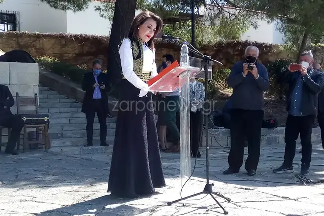 Φορώντας την κρητική παραδοσιακή ενδυμασία, προσαρμοσμένη στο σήμερα, για να τιμήσει τον τόπο που επισκέπτεται εφτασε λίγο πριν τις 11.30 το πρωί της Κυριακής στους Τάφους των Βενιζέλων για να παρευρεθεί στο ετήσιο πολιτικό μνημόσυνο η κυρία Γιάννα Αγγελοπούλου - Δασκαλάκη, Πρόεδρος της Επιτροπής «Ελλάδα 2021».