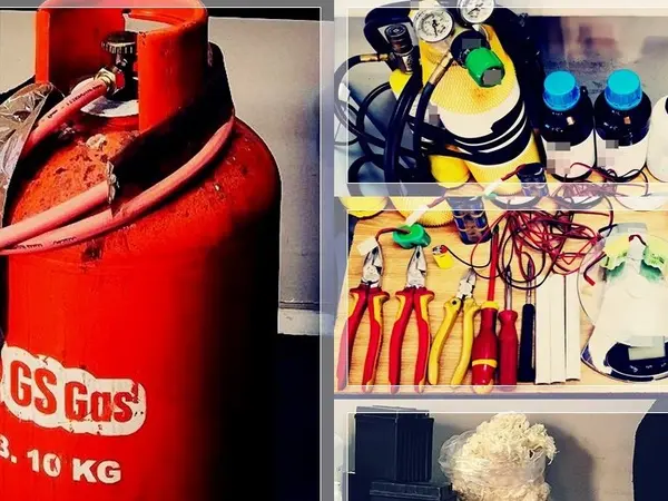 Επιπλέον, πλησίον του οχήματος, βρέθηκαν επιμελώς κρυμμένες σε χαμηλή βλάστηση, δύο κρατικές πινακίδες κυκλοφορίας, που όπως προέκυψε είχαν αφαιρέσει νωρίτερα από Ι.Χ.Ε. αυτοκίνητο ιδιοκτησίας ημεδαπού στην περιοχή. Επίσης, σε παρακείμενο του οχήματος εγκαταλελειμμένο κτίριο, οι συλληφθέντες είχαν κρύψει μία μεταλλική μπουκάλα υγραερίου με εύφλεκτο αέριο, η οποία ομοίως κατασχέθηκε από τους αστυνομικούς.
