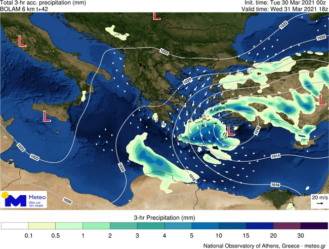 Διήμερη κακοκαιρία φέρνει βαρομετρικό χαμηλό που θα επηρεάσει την Ελλάδα την Τετάρτη και την Πέμπτη (1/2 Απριλίου 2021).
