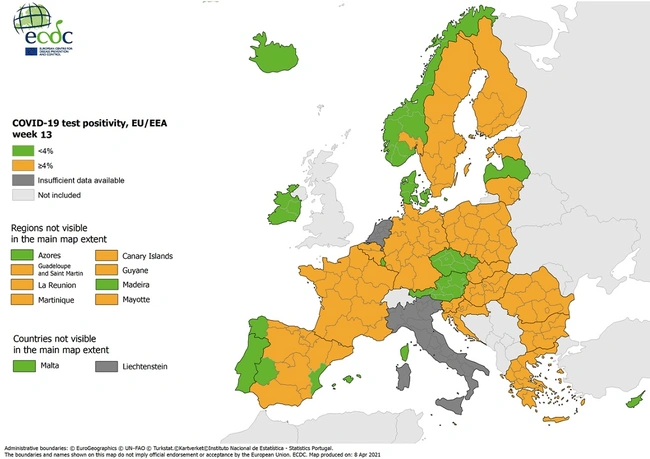 Το Ευρωπαϊκό Κέντρο Πρόληψης και Ελέγχου Νόσων (ECDC) δημοσίευσε σήμερα, Πέμπτη (8/4), τον αναθεωρημένο χάρτη που αποτυπώνει την επιδημιολογική εικόνα της πανδημίας του κορονοϊού στα κράτη μέλη της Ευρωπαϊκής Ένωσης.