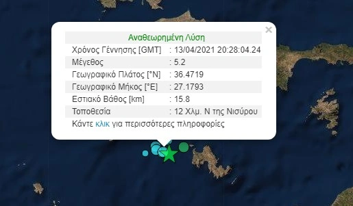 Σύμφωνα με το Γεωδυναμικό Ινστιτούτο, το επίκεντρο του σεισμού εντοπίζεται σε θαλάσσιο χώρο δυτικά της Τήλου και 12 χλμ νότια της Νισύρου.