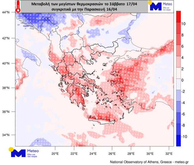Συνολικά, σύμφωνα με τα προγνωστικά στοιχεία του Εθνικού Αστεροσκοπείου Αθηνών/Meteo.gr, το διήμερο Παρασκευής και Σαββάτου η άνοδος της θερμοκρασίας στη Δυτική Ελλάδα θα είναι της τάξης των 10 βαθμών Κελσίου και ακόμα μεγαλύτερη στην Κρήτη.